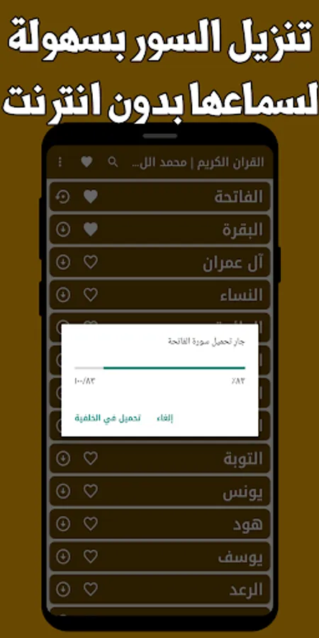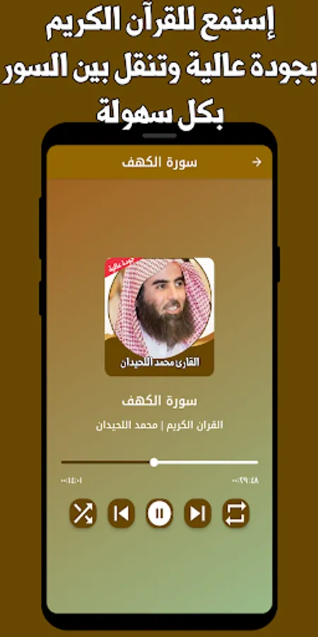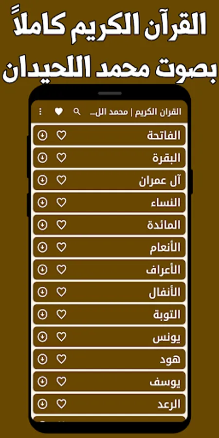 Simple and elegant interfaces where you can choose the surahs that you like, add them to the favorites list, and listen to them without the Internet, with the voice of the reciter Sheikh Muhammad Al-Luhaidan, who has a wonderful voice that makes you humble to hear the verses of God.