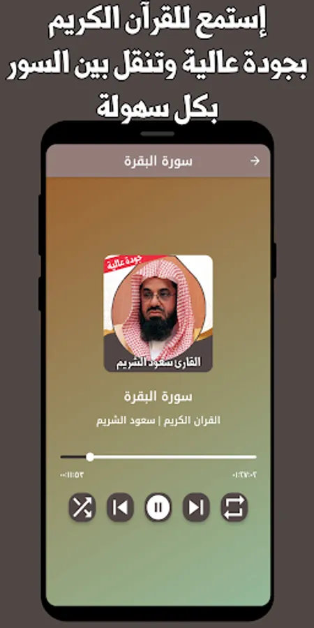 The application is completely free, as after installing the application from the store, you will be able to listen to the Noble Qur’an with the voice of Sheikh Saud Al-Shuraim with the narration of Hafs from Asim with ease.