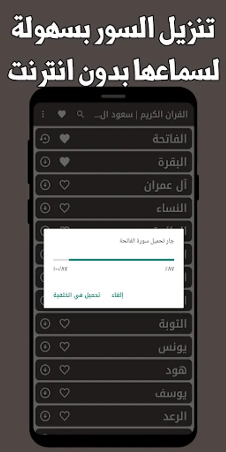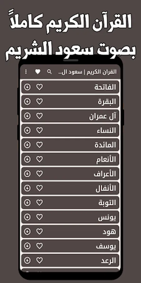 Simple and elegant interfaces, where you can choose the surahs that you like, add them to the favorites list, and listen to them without the Internet, with the voice of the reciter Sheikh Saud Al-Shuraim, who has a wonderful voice that makes you humble to hear the verses of God.