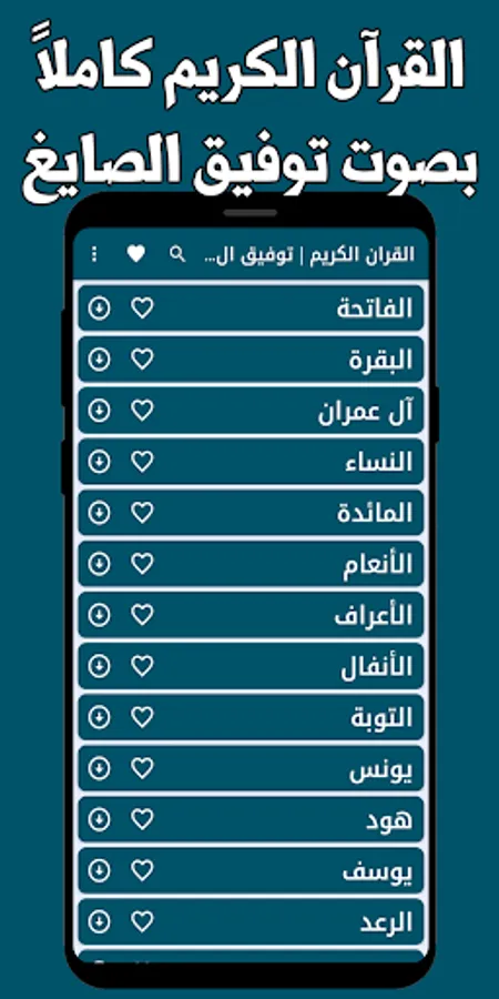 After completing the installation of the application, open it and listen to the surahs of the Noble Qur’an with Sheikh Tawfiq Al-Sayegh in high-quality recitation in mp3 format.