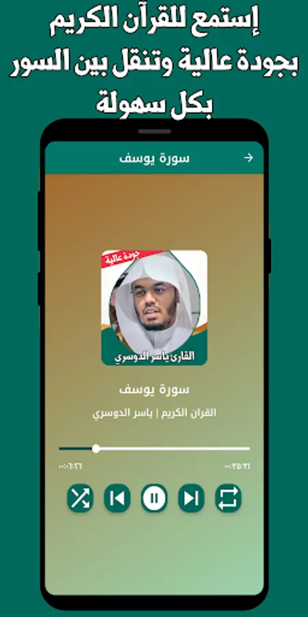 The application is completely free, as after installing the application from the store, you will be able to listen to the Noble Qur’an with the voice of Sheikh Yasser Al-Dosari with the narration of Hafs from Asim with ease.