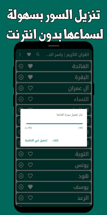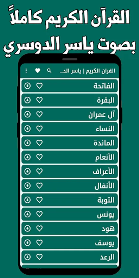 Simple and elegant interfaces, where you can choose the surahs that you like, add them to your favorites list, and listen to them without the Internet, with the voice of the reciter Sheikh Yasser Al-Dosari, who has a wonderful voice that makes you humble to hear the verses of God.