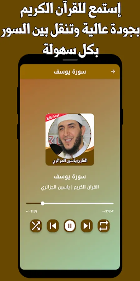 Through this application, you can listen to the Noble Qur’an with the voice of Yassin Al-Jazaery without the net, and the Quran recitation application is characterized by the voice of Yassin Al-Jazaery by being free, and you can download the Holy Qur’an application with the voice of Yassin Al-Jazaery with ease so that you can enjoy reciting the Noble Qur’an with the voice of Sheikh Yassin Al-Jazaery wherever you want and at any time you want We also designed the Holy Quran Yassin Al-Jazaery program without the net to be easy to use with a simple interface and a series with all the required capabilities to help you use the application, and also the fences are available in high-quality voice.