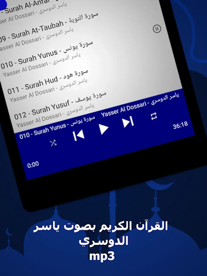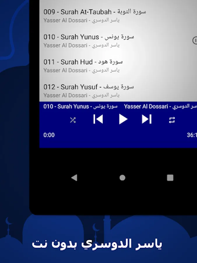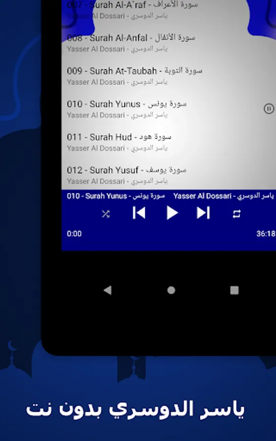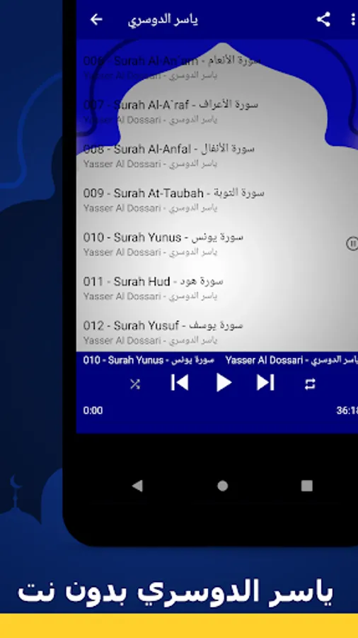 🌟 The surahs available in our application: Yasser Al-Dossary, without the net, a complete Quran