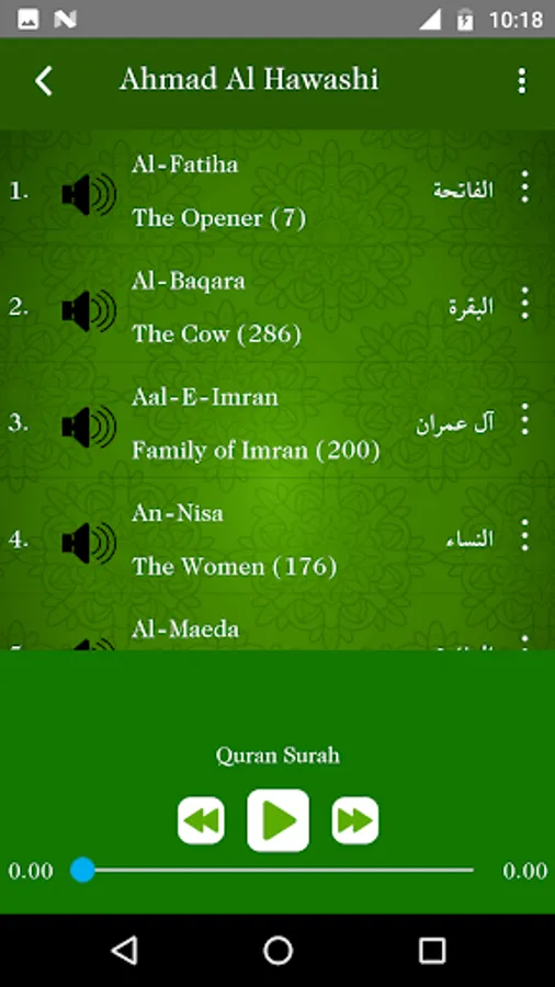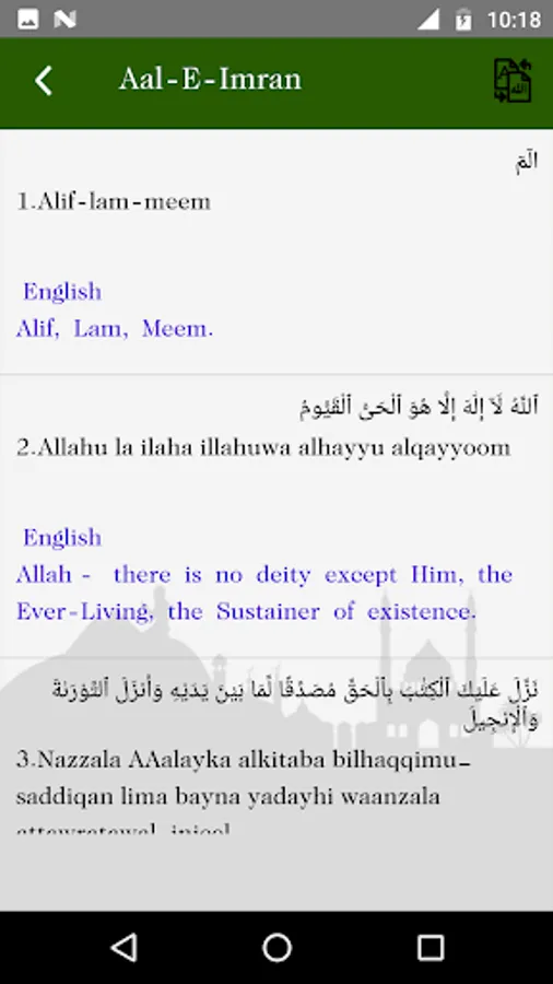 - Arabic Quran Ayat for every Surah and English pronunciation with Each Ayat meaning.