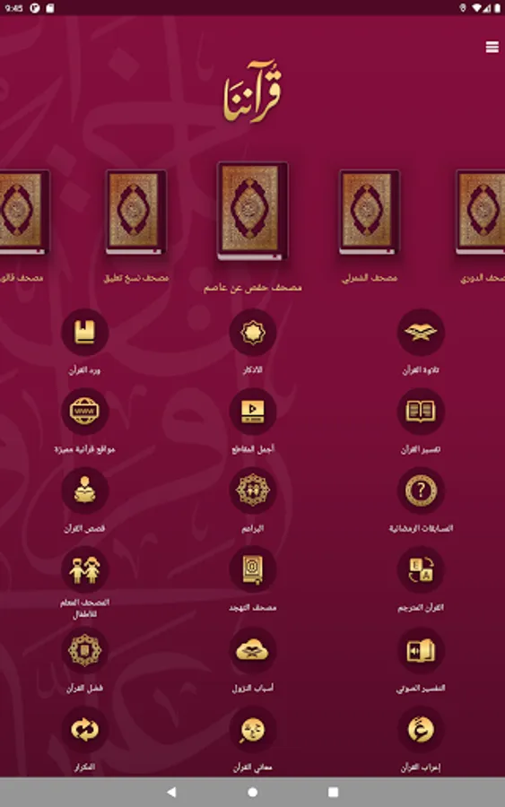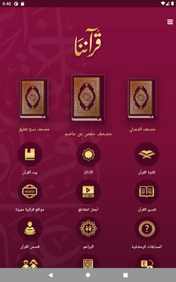 Our Application contains the Holy Quran in several narrations. There are a translations of the meanings of the Noble Qur’an, Interpretation of the Qur’an with 8 different interpretations, the translation of the Holy Quran, the stories of the Holy Quran and Finally, the Ramadan competition
