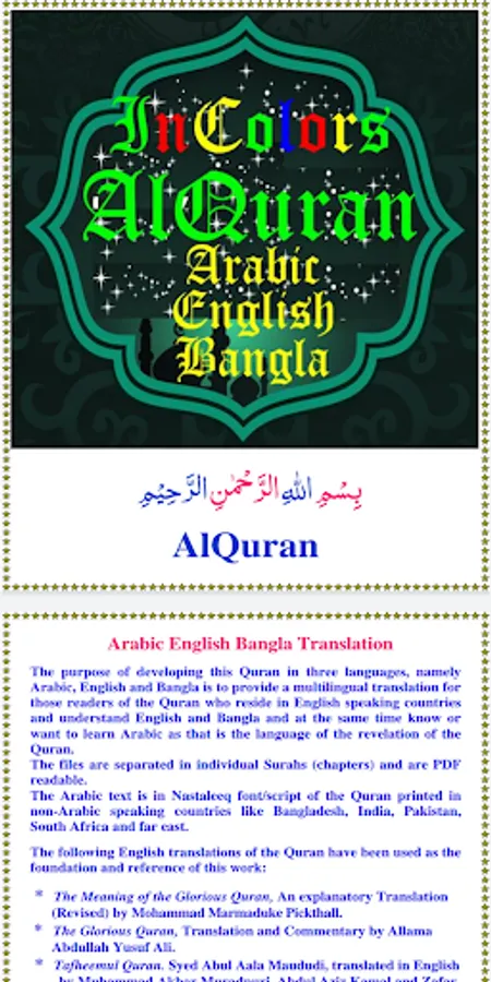 The purpose of developing this Quran in three languages, namely Arabic, English and Bangla is to provide a multilingual translation for those readers of the Quran who reside in English speaking countries and understand English and Bangla and at the same time know or want to learn Arabic as that is the language of the revelation of the Quran.