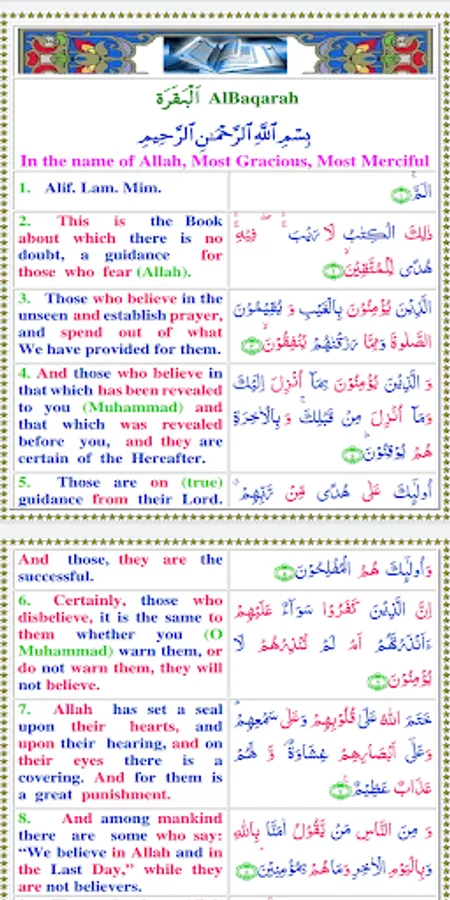 Blue and red colors are alternately used for Arabic words and the corresponding English words. Green color in the English translation is used for comments or other words which are implied and not explicit in the Arabic Quran. Translators often use them to bring-out the meaning implicit in the Arabic Text.