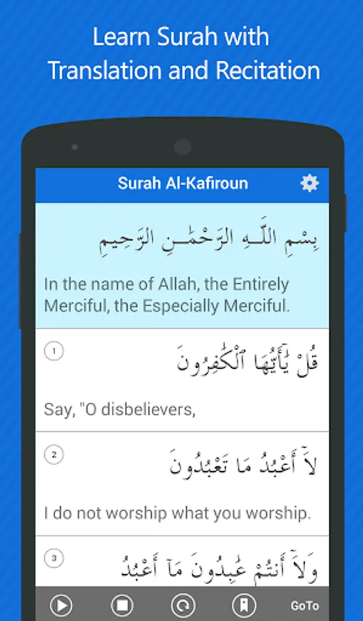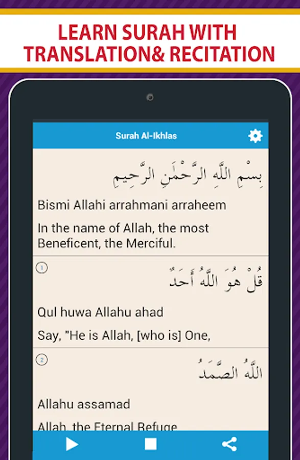 • Play and Stop choices are offered to start and pause the recitation anytime.