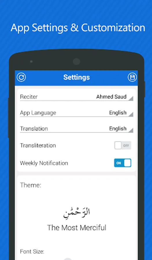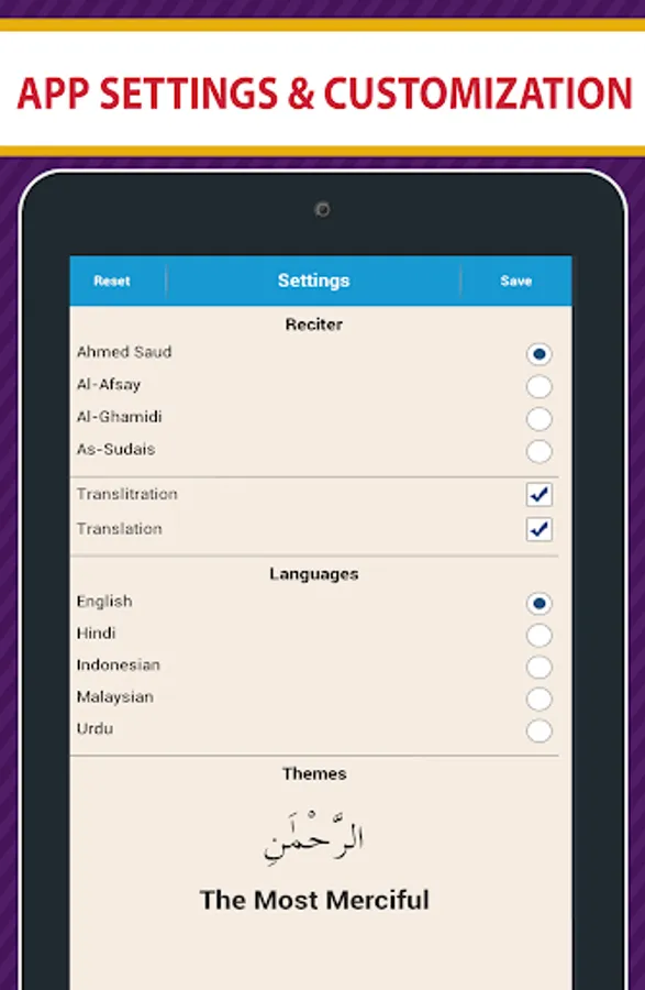 • Translation of the real implication of the hallowed verses into English, Hindi, Indonesian, Malaysian and Urdu helps user in better understanding.