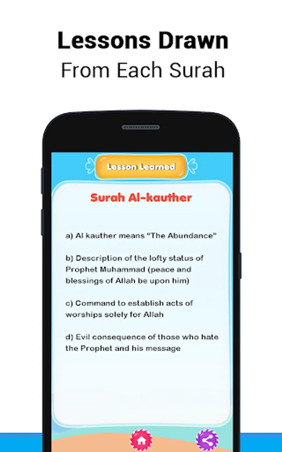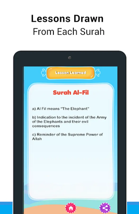 • Lessons Learned sign leads to knowledge about specific instructions in each Surah.