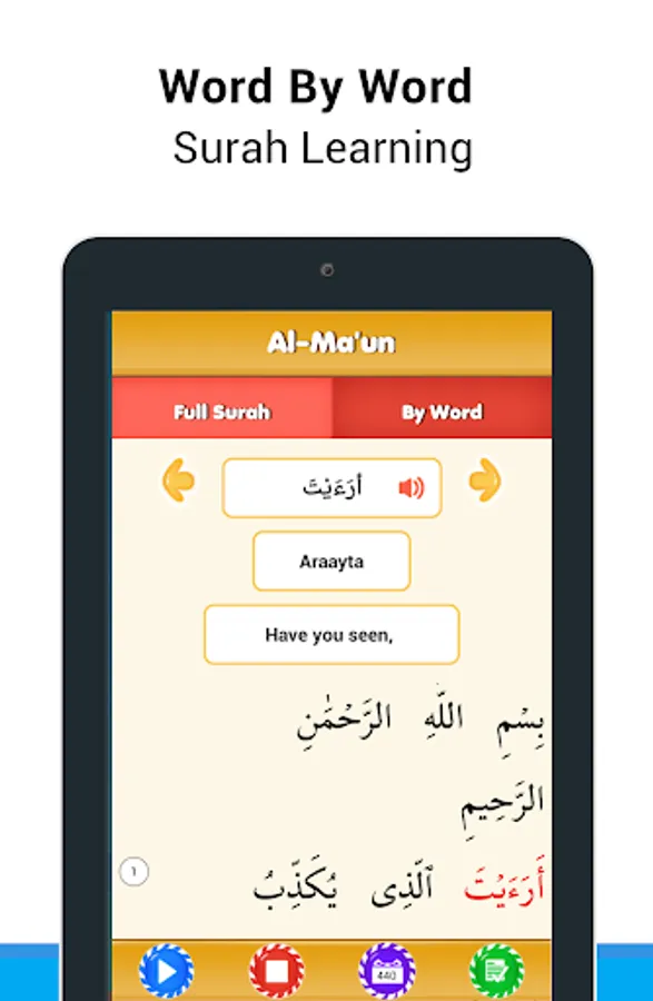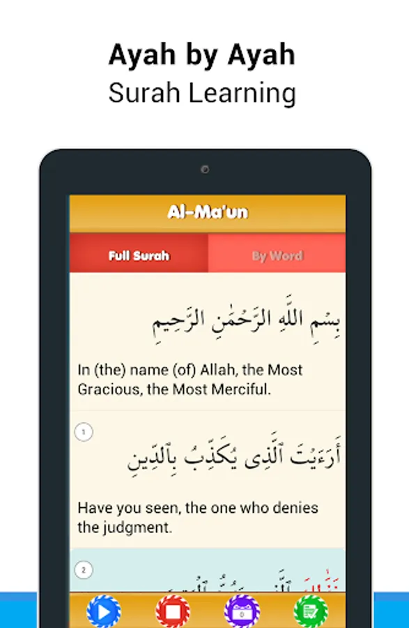 • By Word option is also available in for fresh learners to read Quran Verses closely.