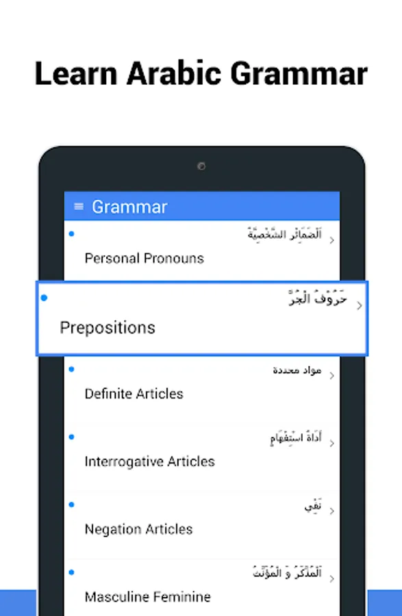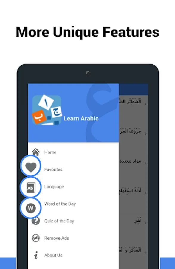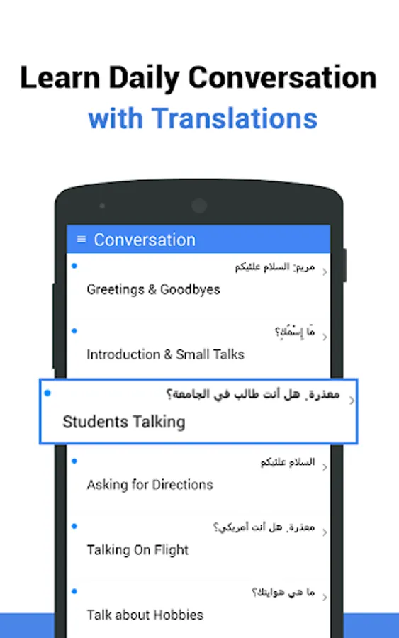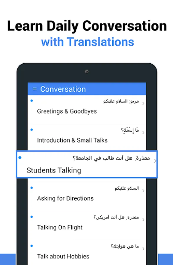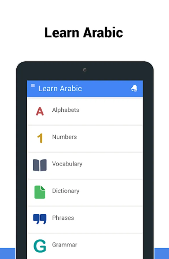 Learn Arabic will allow you to speak basic Arabic language and serve as a learning app for non-Arabs. Tap on each word to hear the narrator speak the Arabic words. The voice recording of Arabic to English translation benefits the users in learning Arabic. It has followings sections: