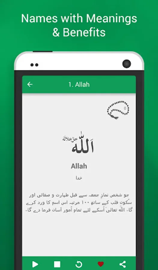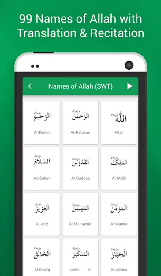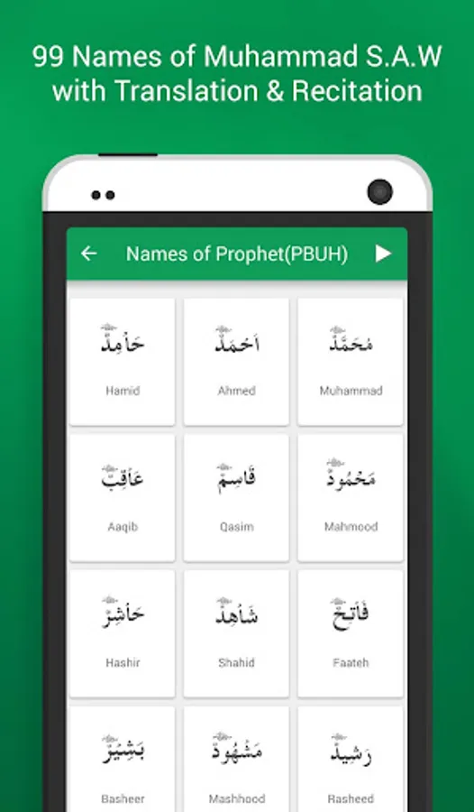 99 Names is an Islamic Smartphone application that has been produced with an aim to let Muslims all over the world get familiar with the 99 Beautiful Names of Allah SWT (Asma ul Husna) and His Messenger, Hazrat Muhammad PBUH (Asma ul Nabi) each.