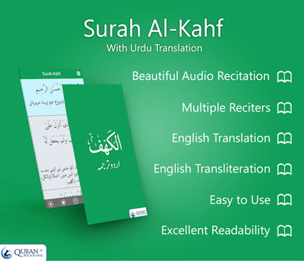 • Word-by-word audio recitation, transliteration, and translation of Surah Kahf verses in languages including English, Spanish, Chinese, Italian, Dutch, Hindi, Melayu, Bengali and Urdu.