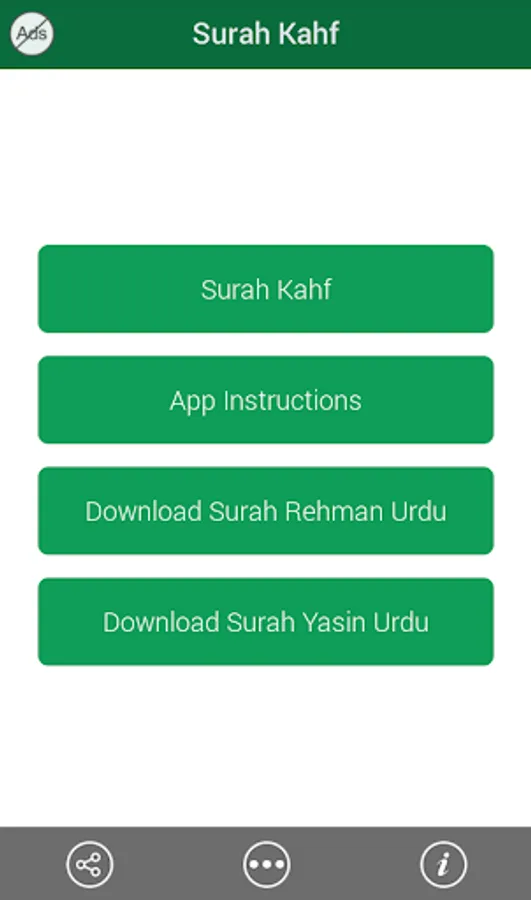 Main window comprise Surah Kahf, description to the app and options to download Surah Rahman for spiritual ailments.