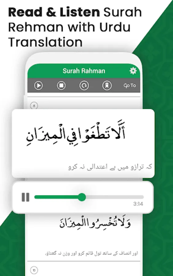 Surah Rahman Urdu Translation is an android app, which have complete Urdu translation of surah Yaseen surah rahman and surah kahf also audio is recited by Shaikh Qari Mishary Alafasy which play offline, you can also read Surah Rahman and its tafseel in English or Urdu.