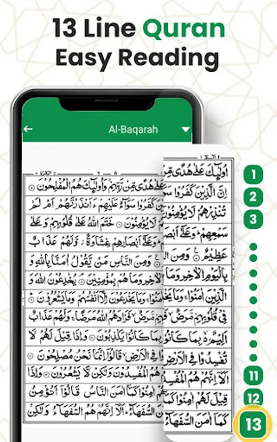 13 Line Quran Per Page is a simple, unique and comfortable Quran Reading Application. It is similar to the actual Quran as it contains scanned Quran pages. It provides easy page by page Quran reading so now you don’t need to worry about scrolling screens again and again. Select Surahs or JUZ and start The Holy Quran recitation today by 13 line Quran app.