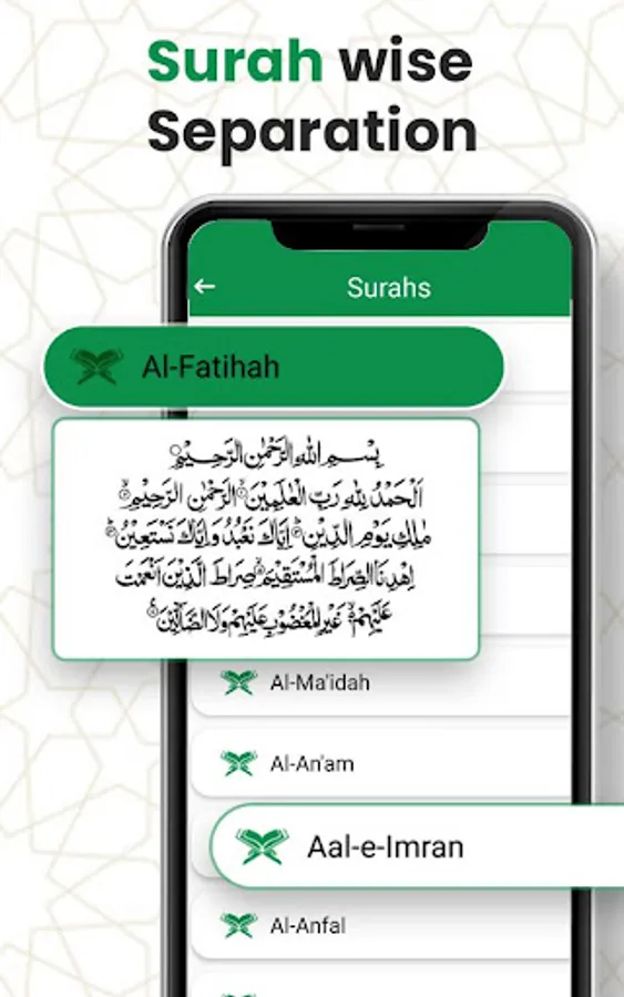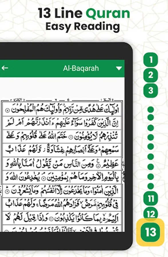 In Surah wise division, this Section of Quran reading helps to recite Quran in Surah/Surahs order. All 114 surahs From Surah Al-Fatiha to Surah Al NAS are added in the 13 line Quran app.