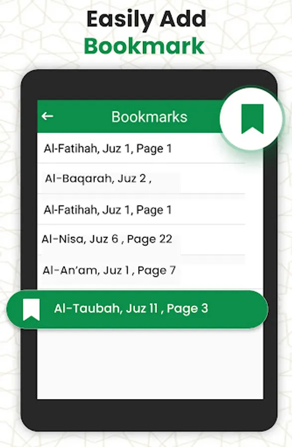 With this Quran Majeed app you easily add Bookmarks for any page both in Surahs and JUZ Mode of 13 line Quran per page app. Save bookmarks easily by tapping/clicking bookmark icon given on the bottom navigation bar of this Quran reading app.