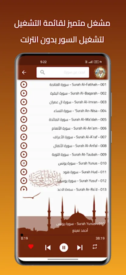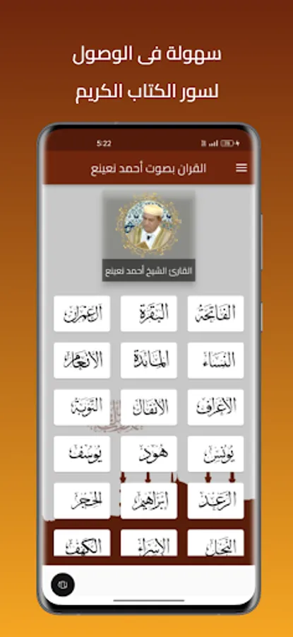 The application of the Noble Qur’an provides the voice of the reciter Ahmed Nainaa. You can hear all the surahs of the Holy Qur’an through your device, whether it is your mobile phone or your tablet, with ease and ease through one program and application that contains all the surahs of the Holy Qur’an. For all devices that operate with the Android system, you do not need the Internet on your mobile phone to listen until you enjoy reciting the Noble Qur’an with the voice of Sheikh Ahmed Nainaa wherever you want.