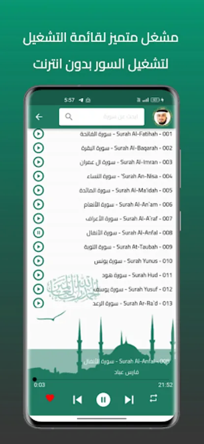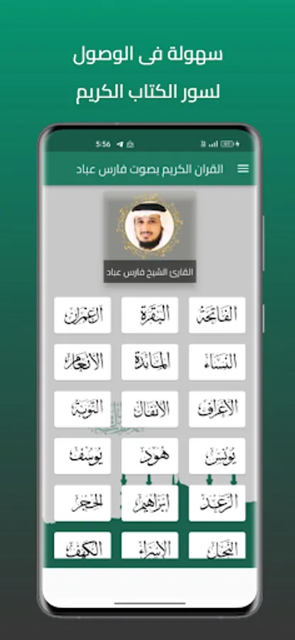 The application of the Noble Qur’an provides the voice of the reciter Fares Abbad. You can hear all the surahs of the Holy Qur’an through your device, whether it is your mobile phone or your tablet, with ease and ease through one program and application that contains all the surahs of the Holy Qur’an. For all devices that operate with the Android system, you do not need the Internet on your mobile phone to listen until you enjoy reciting the Noble Qur’an with the voice of Sheikh Fares Abbad wherever you want.