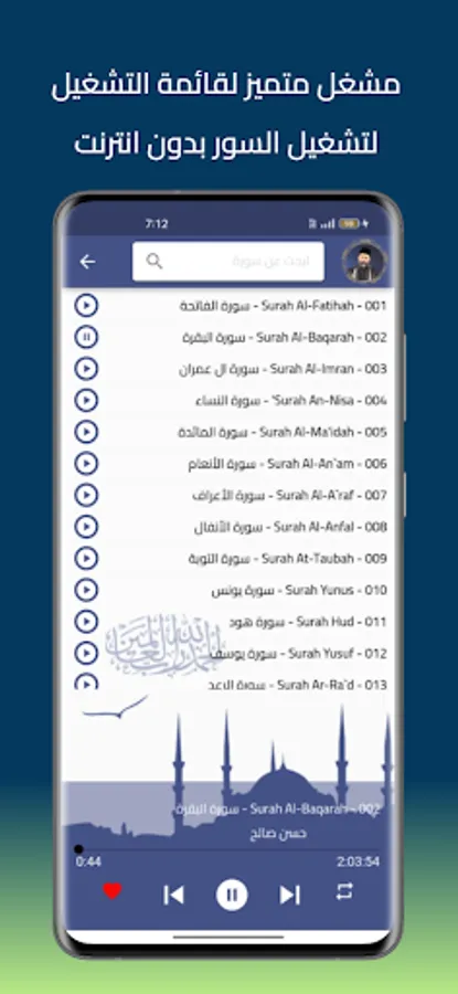 The application of the Noble Qur’an provides the voice of the reciter Hassan Saleh. You can hear all the surahs of the Noble Qur’an through your device, whether it is your mobile phone or your tablet, with ease and ease through one program and application that contains all the surahs of the Noble Qur’an. For all devices that operate with the Android system, you do not need the Internet on your mobile phone to listen until you enjoy reciting the Noble Qur’an with the voice of Sheikh Hassan Saleh wherever you want.
