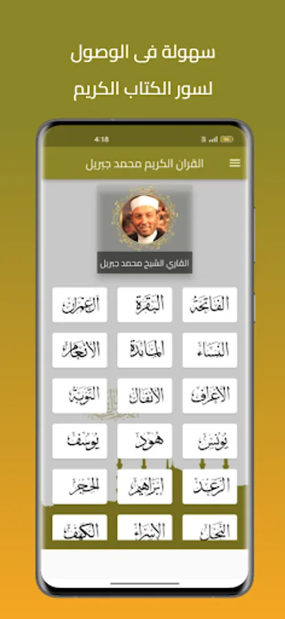 The application of the Noble Qur’an provides the voice of the reciter Muhammad Jibril. You can hear all the surahs of the Noble Qur’an through your device, whether it is your mobile phone or your tablet, with ease and ease through one program and application that contains all the surahs of the Noble Qur’an. For all devices that operate with the Android system, you do not need the Internet on your mobile phone to listen until you enjoy reciting the Noble Qur’an with the voice of Sheikh Muhammad Jibril wherever you want.