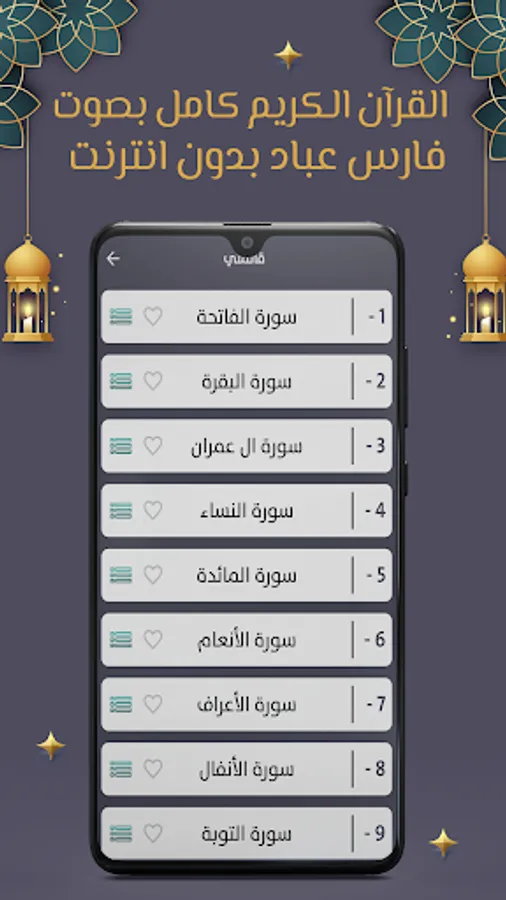 Our application, Fares Abbad, complete Qur’an without the net, enables you to hear the entire Holy Qur’an through your mobile phone or tablet with ease and ease through one application that contains all the surahs of the Holy Qur’an. The verses and listen to it at the same time and it is free as it is available on the store for Android phones. In order to enjoy reciting the Noble Qur’an with the voice of Sheikh Fares Abbad wherever you want.