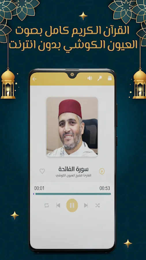 After downloading the application of Al-Ayoun Al-Kushi, a complete Quran without the net, you can listen to the surahs of the Noble Qur’an with the voice of Sheikh Al-Ayoun Al-Kushi for free, anytime and anywhere with ease.