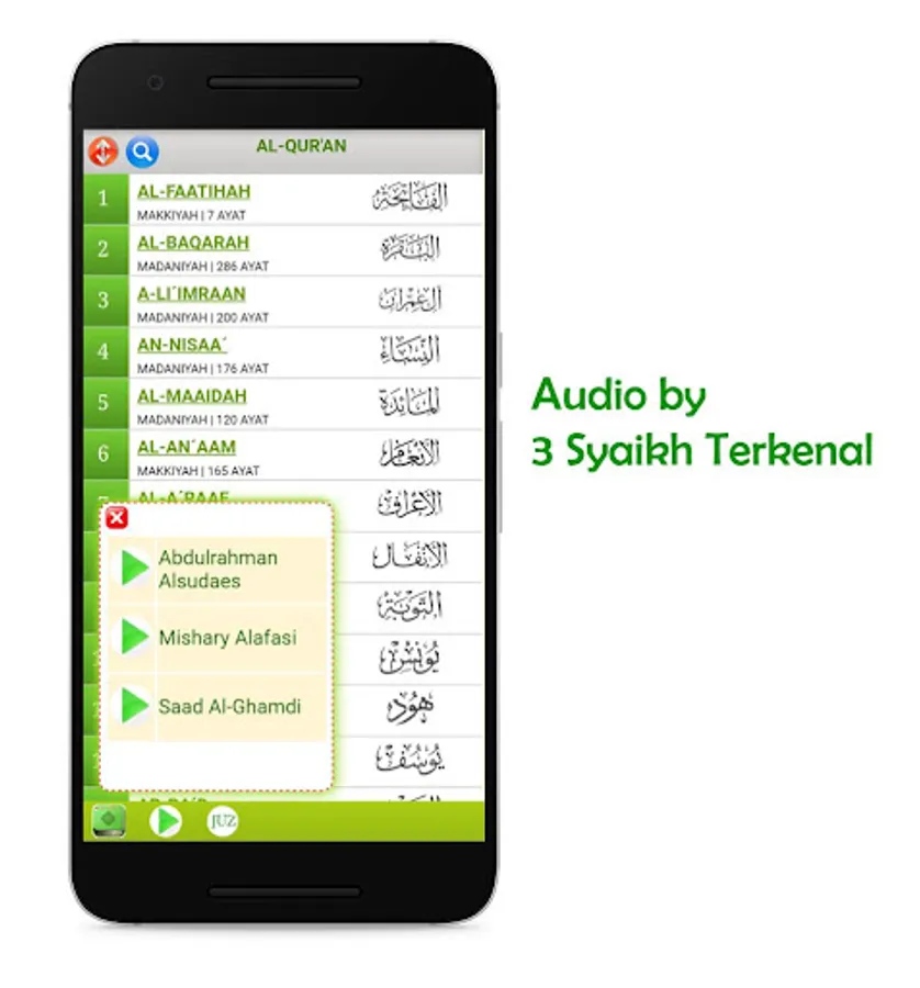 - Quran with audio by 3 famous sheikh syaikh Mishary Alafasy namely, syaikh Saad Al Ghamidi, by Sheikh Abdurahman Al Sudais