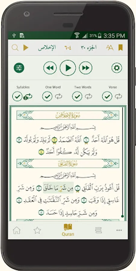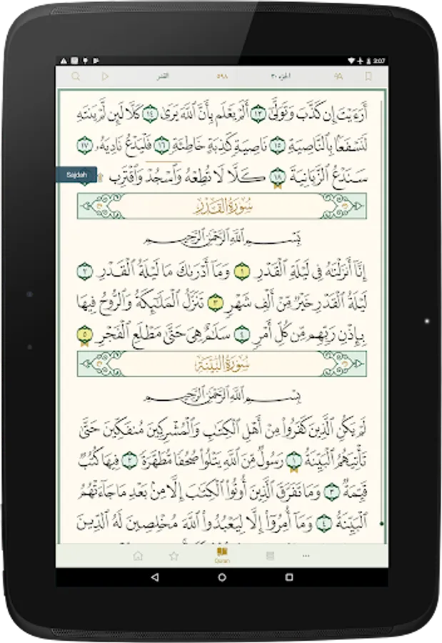 Bayan Quran is the most beautiful Quran you've ever seen on a mobile device. Bayan Quran has been exclusively designed from the ground up especially for Android devices. The art in the app was custom designed by some of the best Quran artists in the world. Painted greens, illuminated gold ink, and beautiful paper give you an amazing experience.