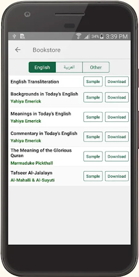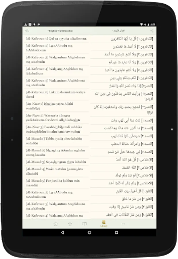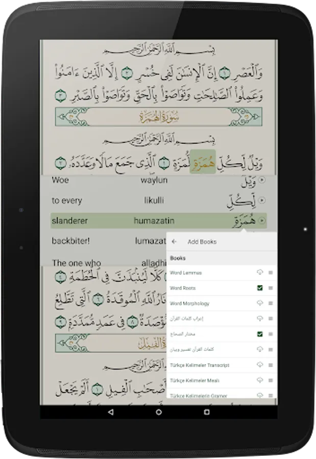 Tap on any Ayah Number to access the library panel and tap on the title of the current book to choose from any of the available books in your library. Add any books you want from the bookstore including Translations, Commentaries, Reasons of Revelation (asbab nuzul), and much more. (some of this coming soon).