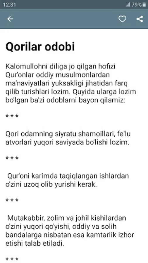 - Qorilar haqida, Qorilar odobi va 7 yetti qiroat qoriladi haqida ma'lumotlar mavjud.
