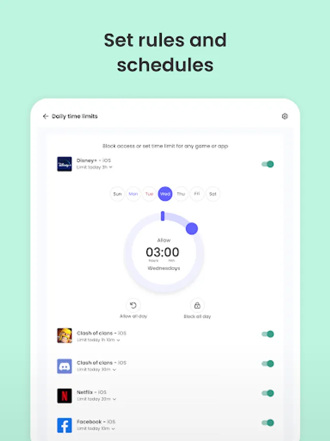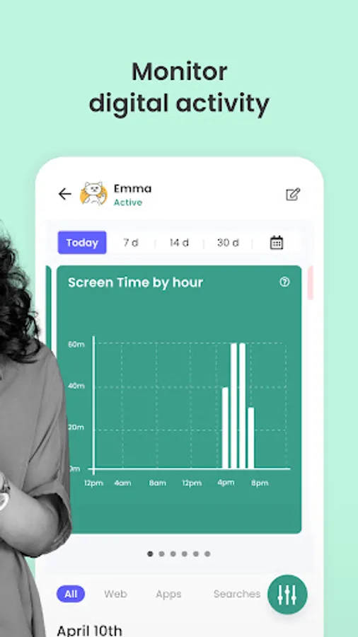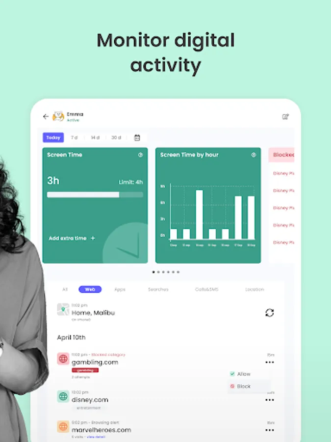 To personalize filters, set time limits and monitor activity, use the parent’s app: Qustodio Parental Control App.