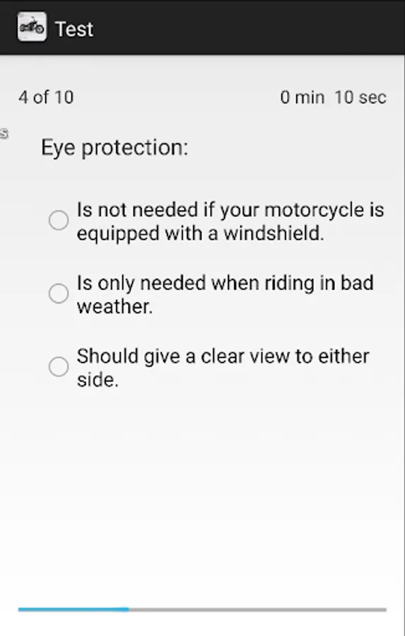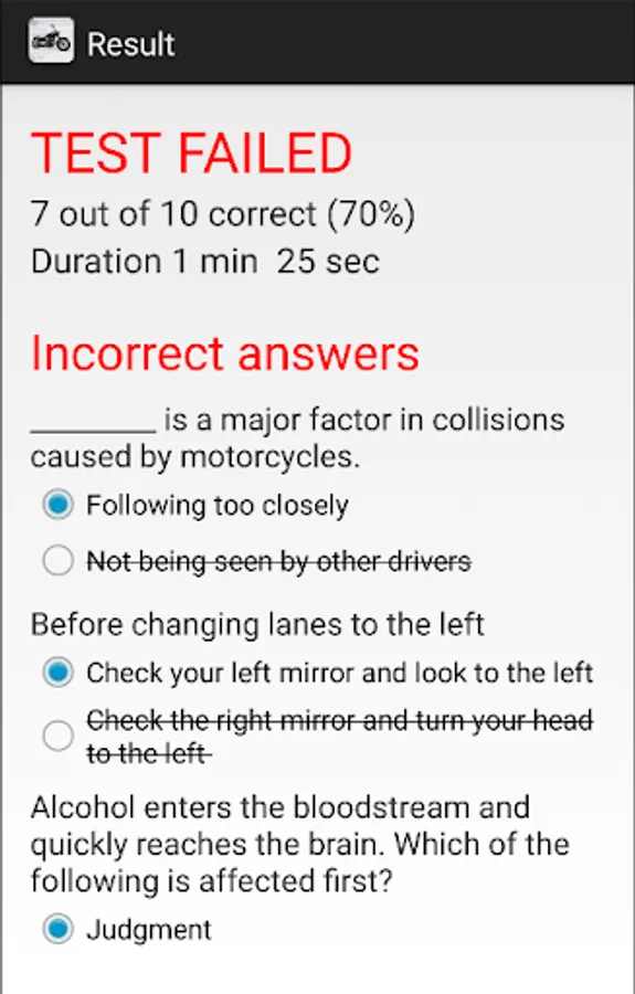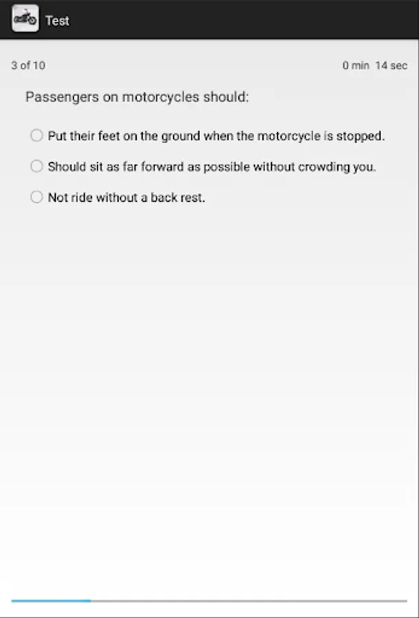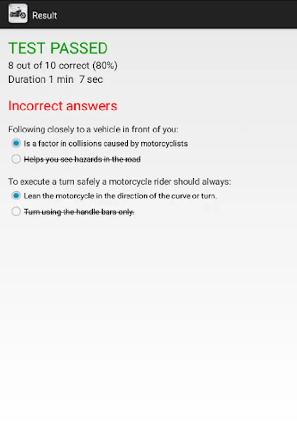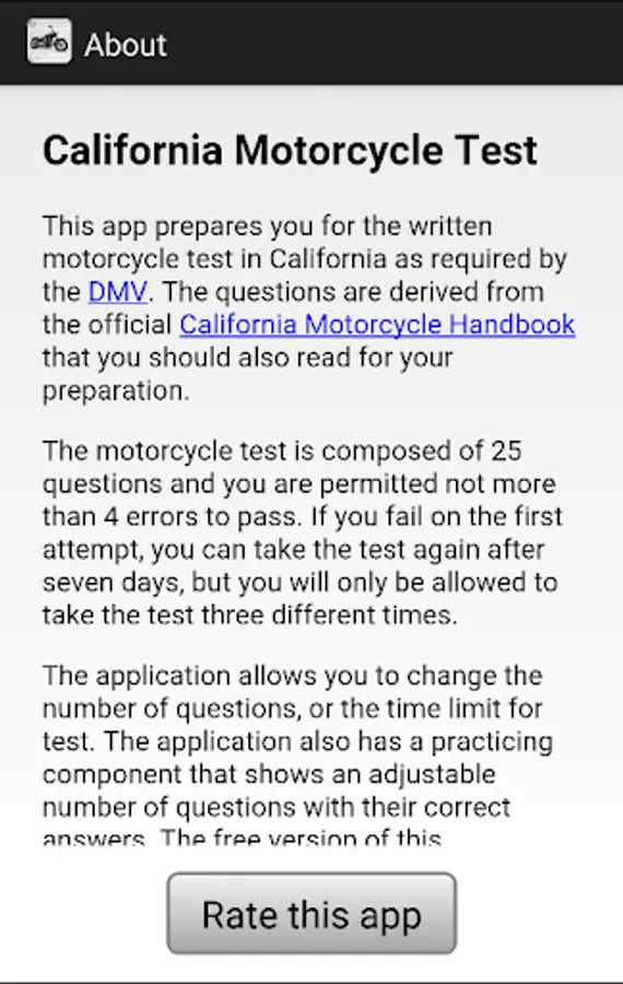 This is the most comprehensive app to prepare for the California motorcycle permit test. The motorcycle test is composed of 25 questions and you are permitted not more than 4 errors to pass. The free version of this app is limited to 50 test questions. Upgrading to the premium version adds over 200 more questions. If you can answer all of them you will pass the California motorcycle test with ease.