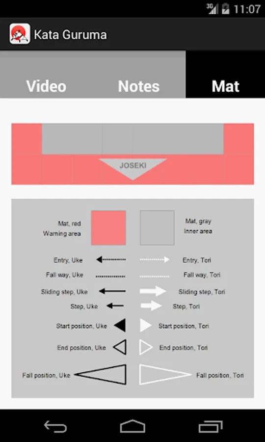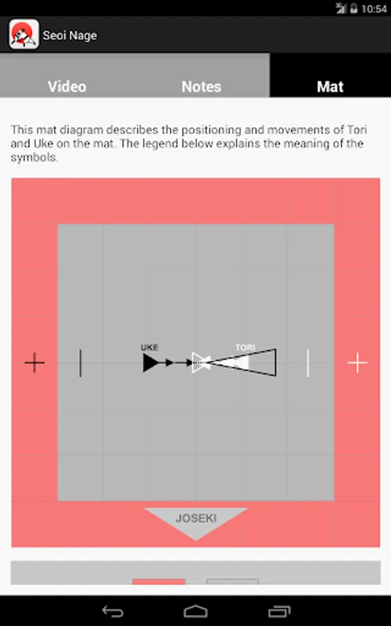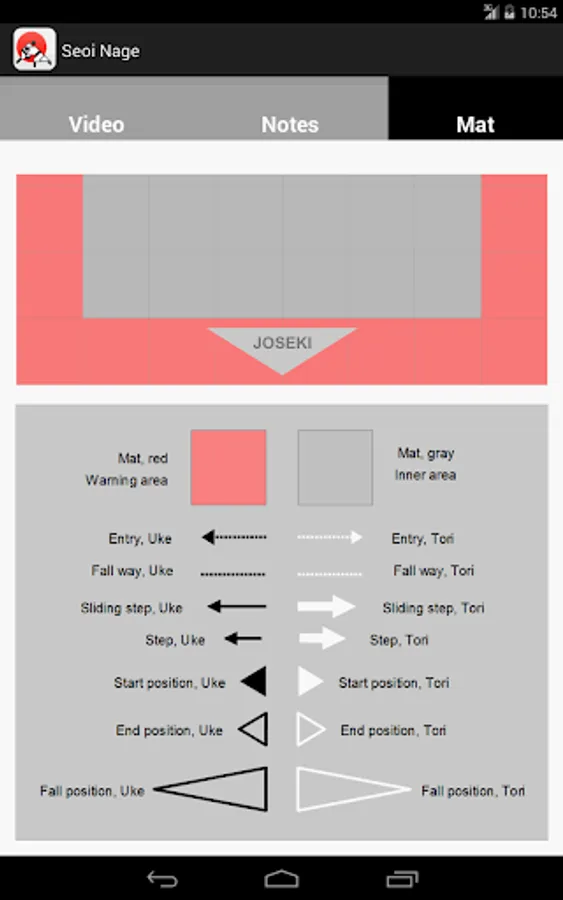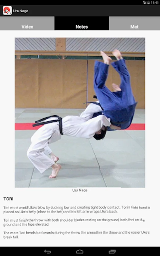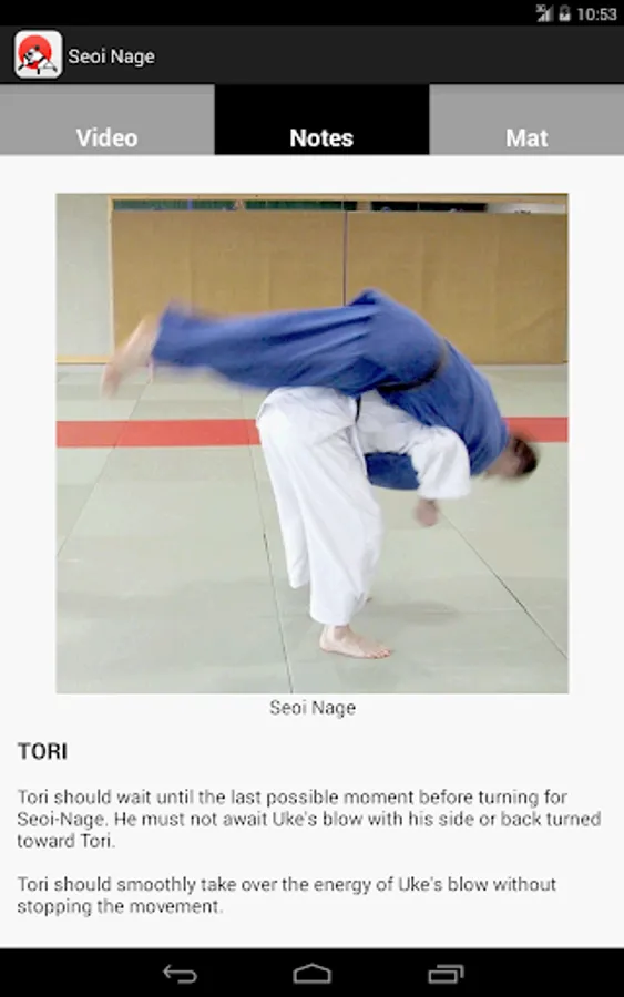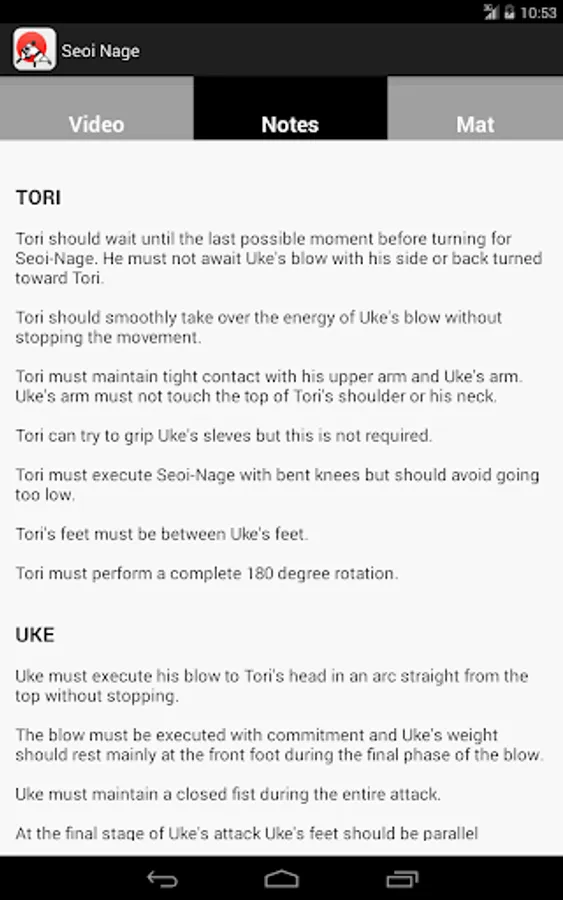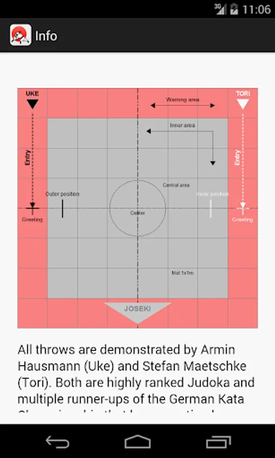 This app demonstrates the throws of the Nage-No-Kata in short video clips, describes important aspects of each throw and provides diagrams that clearly define the positions and movements of Tori and Uke on the mat.