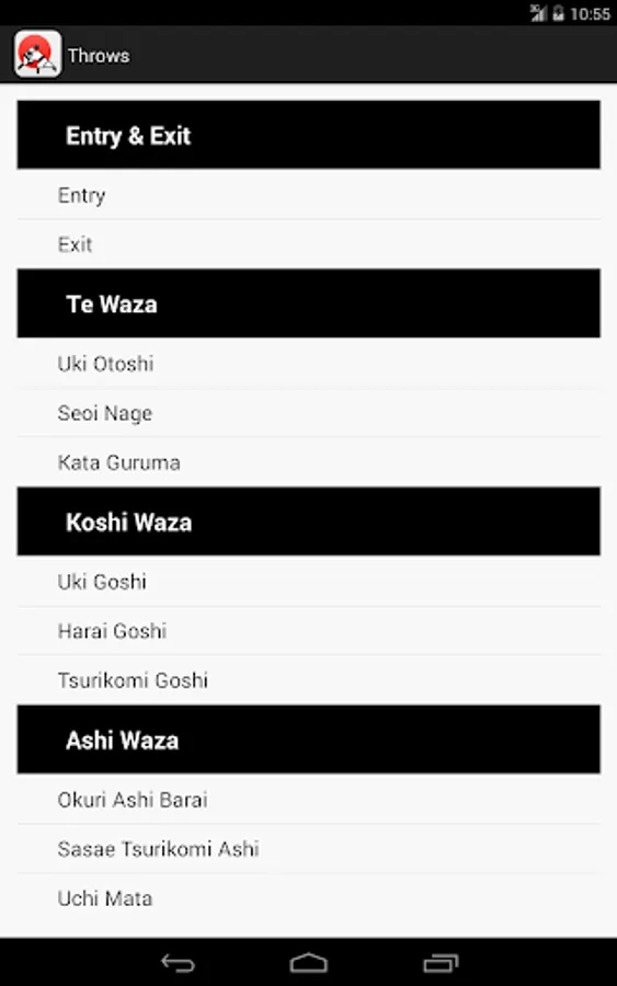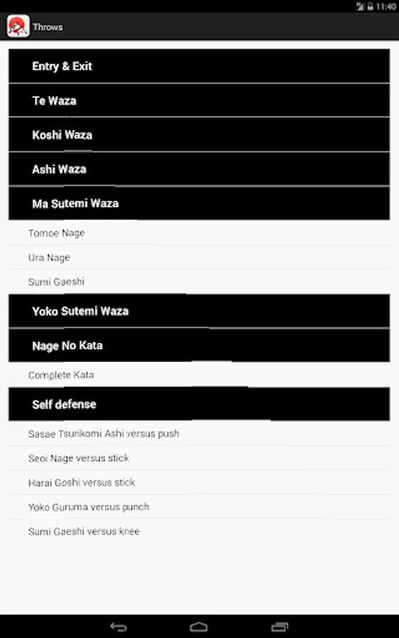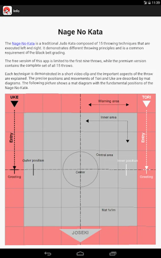 The free version of the app is limited to the first nine throws, while the premium version contains the full set of all 15 throws, the complete Kata and some self defense applications.