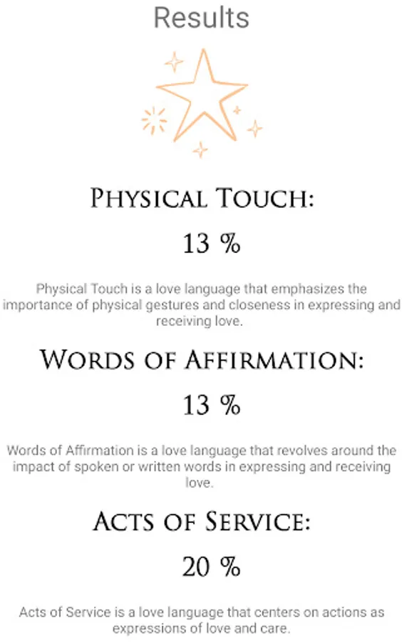 Receive a detailed analysis of your love language profile. Learn what your dominant love language says about your preferences and how you can use this knowledge to strengthen your relationships.