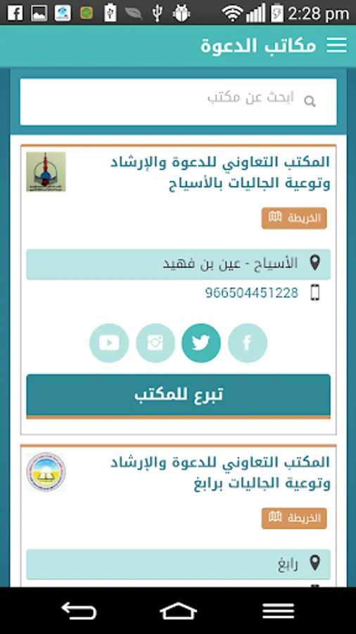 Application facilitates access to the data call offices in the Kingdom, both figures contiguity or addresses on the map or their social networking pages, thereby enabling them to communicate and follow up on their activities and advocacy at any time.