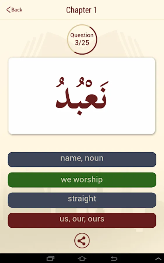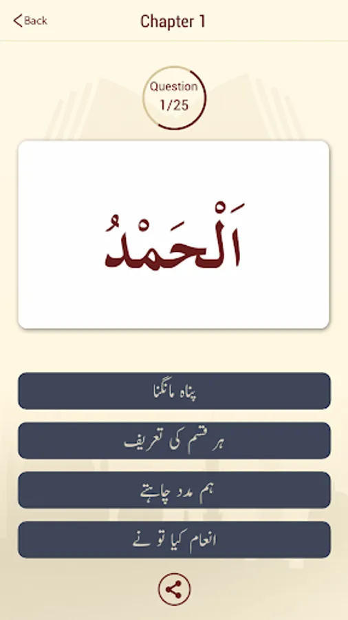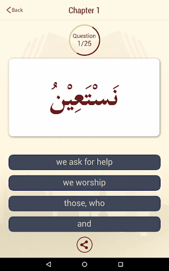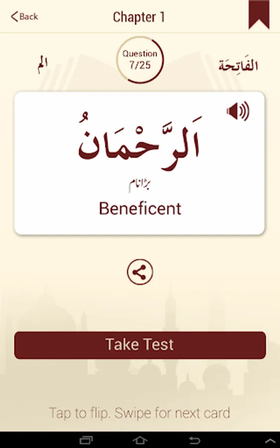 Start by the first letter of the quran and learn its english or urdu meaning. Keep on going until you reach the last word in the quran in a memory based flashcard style. While learning, you can take a MCQ (multiple choice test) with four options to see if you have mastered the meaning of the islamic text. Choose the correct option to see the next word. So its kind of like a game. Once you complete a chapter, you can share the results with your facebook friends or via email.