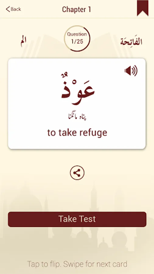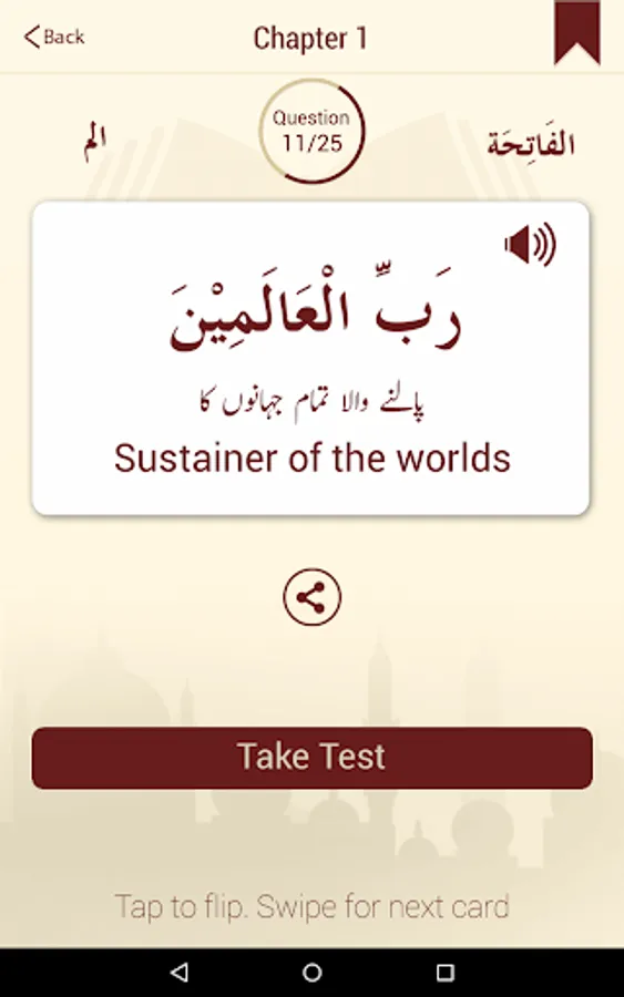 Learn the 6700 unique words of the Holy Quran in an easy to use flashcard style app. The Arabic of each word is displayed on a card that can be tapped to see its English and/or urdu translation. You can then swipe to see the next card and explore different lessons and chapters. Once you have memorized few words, take a multiple-choice test (in English or Urdu) to see how much you have mastered.