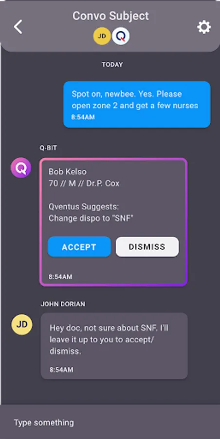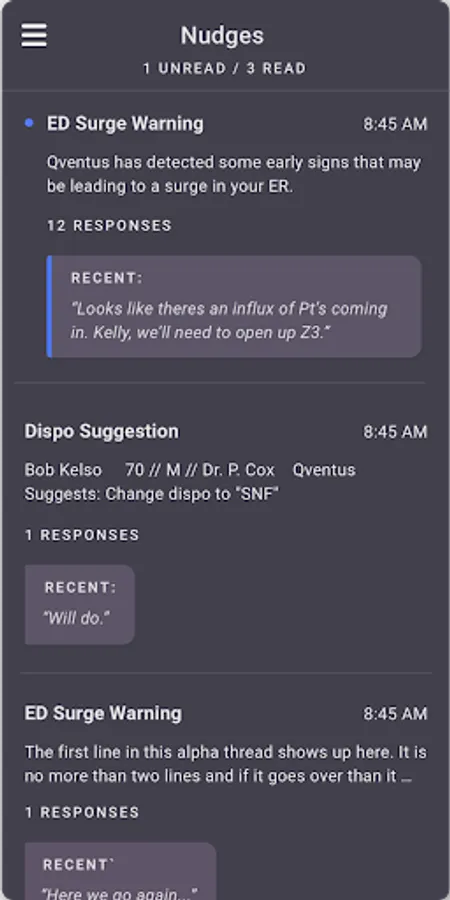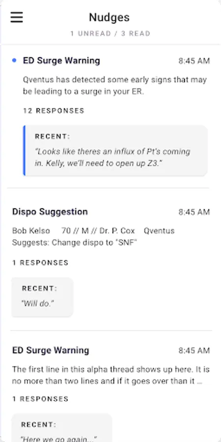 This application will be used by front line staff at Qventus hospitals to obtain "nudges", respond to them and communicate to other members of their team regarding them.