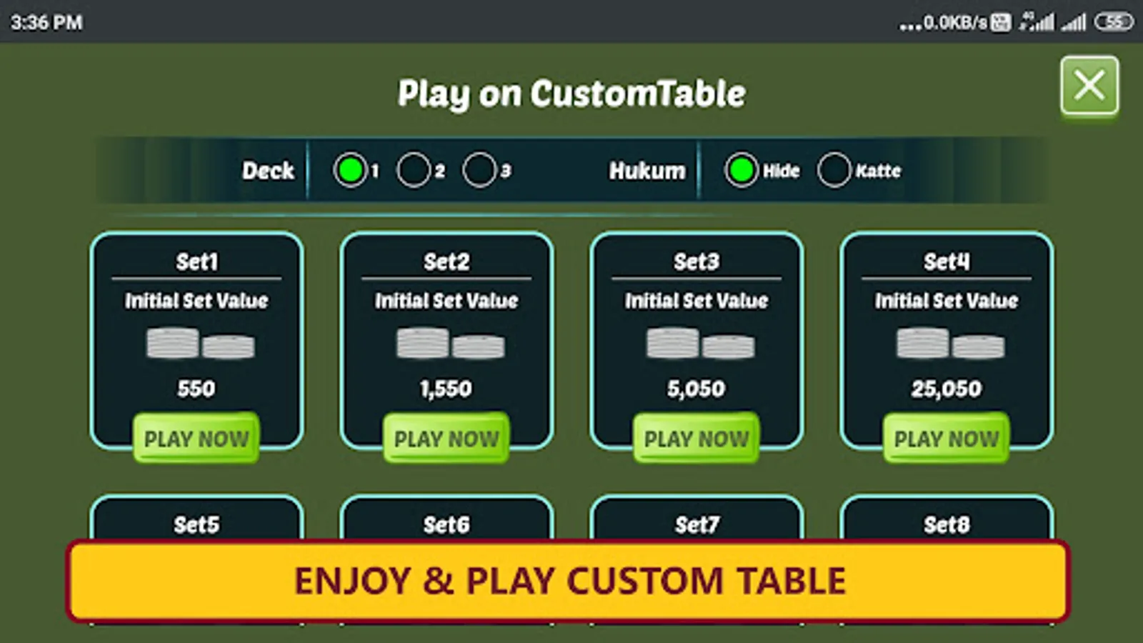 2 katte hukum : Play begins without choosing a trump suit. The first time that a player is unable to follow suit, the suit of the card that he or she chooses to play becomes trump for the deal. (Playing a trump on a plain suit lead is known as cutting).