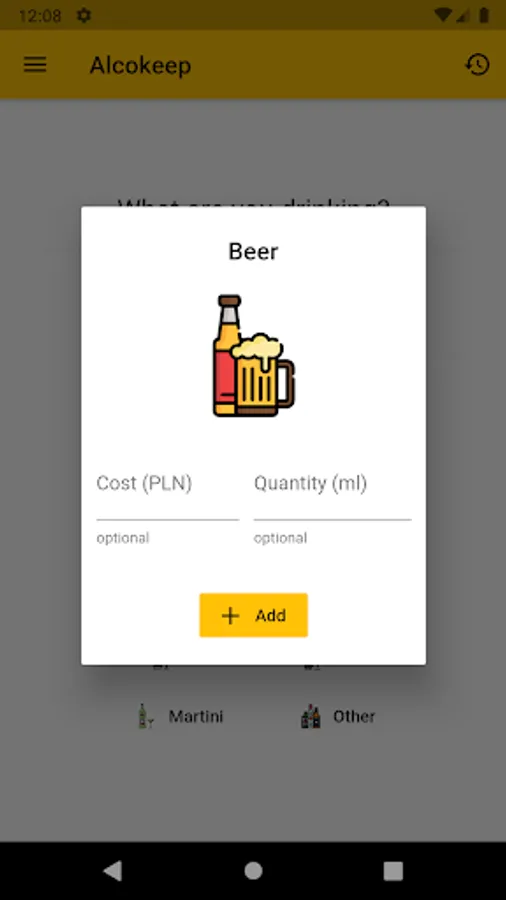 The application supports different alcohol types: Absinthe, Beer, Brandy, Champagne, Gin, Martini, Rum, Sangria, Vodka, Whiskey and Wine. If the alcohol you are looking for is not already present, you can add a custom one. You only need a few clicks to add your alcohol consumption to history.