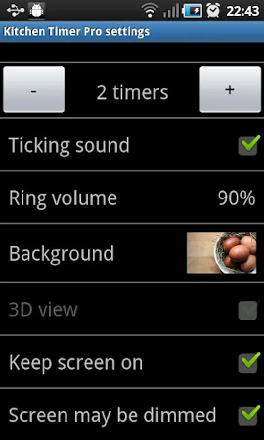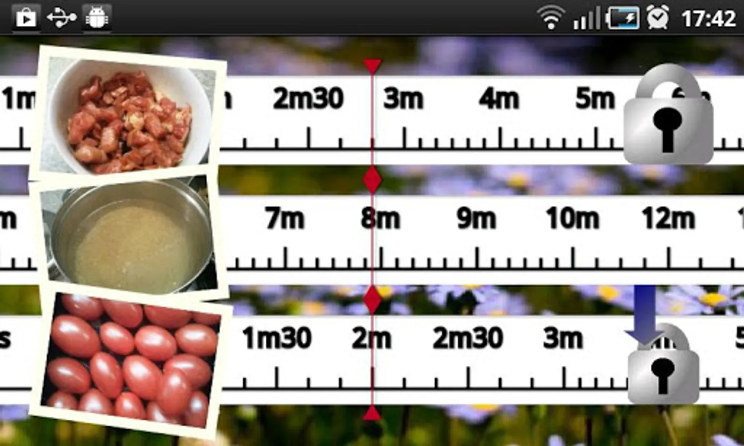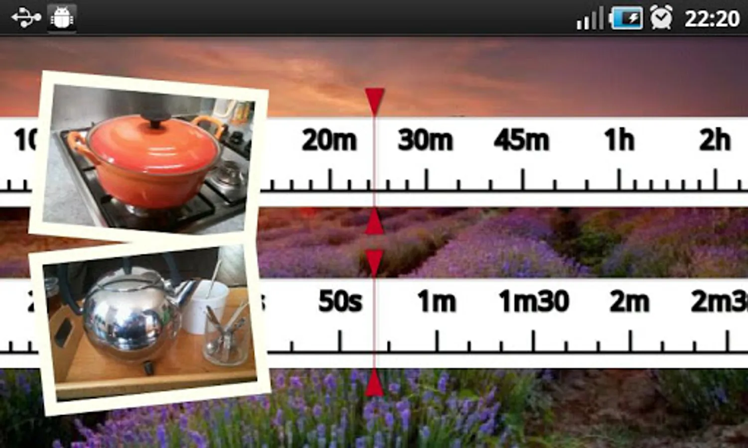 Ad-free easy to use kitchen timer. Set by sliding your finger over the screen. Ranging from 1 second to 12 hours. Four timers supported simultaneously. Let's you make pictures of the pan/product you're timing. Over 40 background images to choose from. Locking feature to lock timer until you unlock, or to auto unlock timer if previous timer rang.