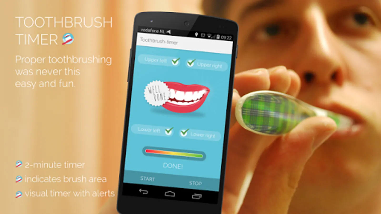 Of course we all know that cleaning our teeth is important for healthy and beautiful teeth. However sometimes it tends to be quite hard to do it right: getting around all parts and keep brushing for 2 minutes. This app, the Toothbrush timer can be of help.