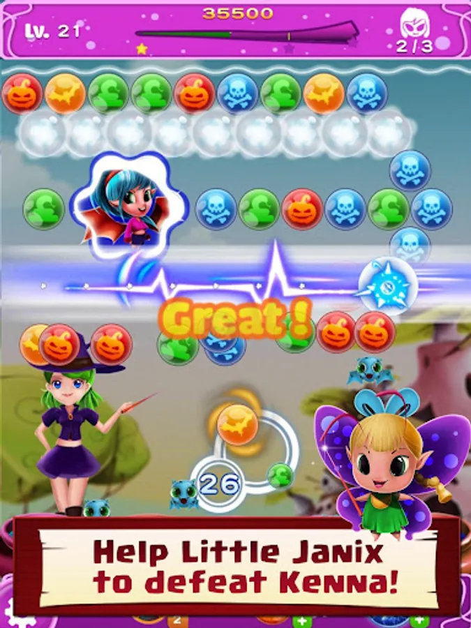 This addictive Puzzle Bubble POP Game invites you to the Magic World of Witchland, an exciting Magic Bubble Shooting Adventure!