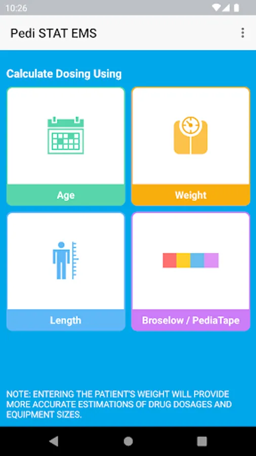 Medication dosing and pediatric equipment sizes are easily and rapidly accessed, and accurately calculated based on provider input of either weight, length, age, or Broselow / Pediatape weight estimates. We are attempting to eliminate medical errors by calculating not only the correct pediatric medication dose, but also the volume to be administered for patient specific conditions. We have also included algorithms and medical calculators to assist providers in multiple areas, including managing pediatric cardiac arrest, burn size estimation and fluid resuscitation, and Glasgow Coma Scale.