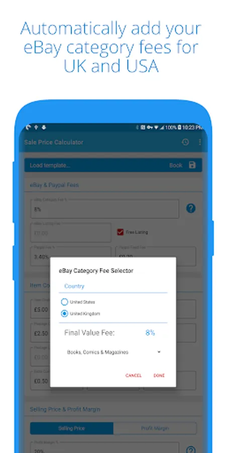 Sale Price includes a helpful tool to fill out your UK & USA category fees automatically! Just search for your category and Sale Price will fill out the percentage fee for that eBay category!
